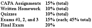 If, for some non-trivial reason, you will be unable to take an exam at the scheduled time, I may allow you to take a make-up exam; however, you must contact me at least 1 week prior to the exam date. Rescheduling is your responsibility, not mine! Grades: Final grades will be computed as follows: |