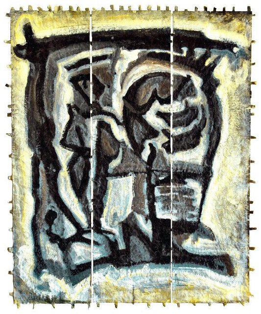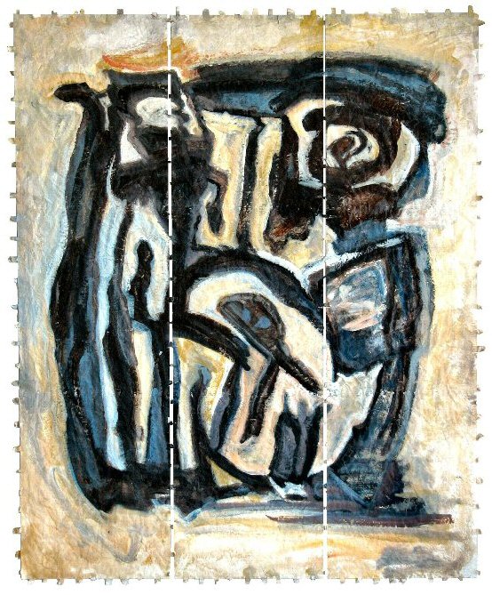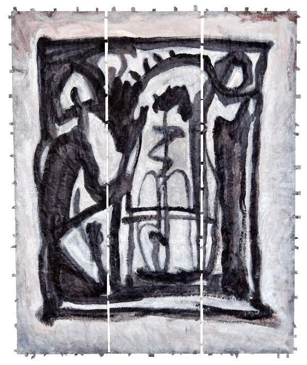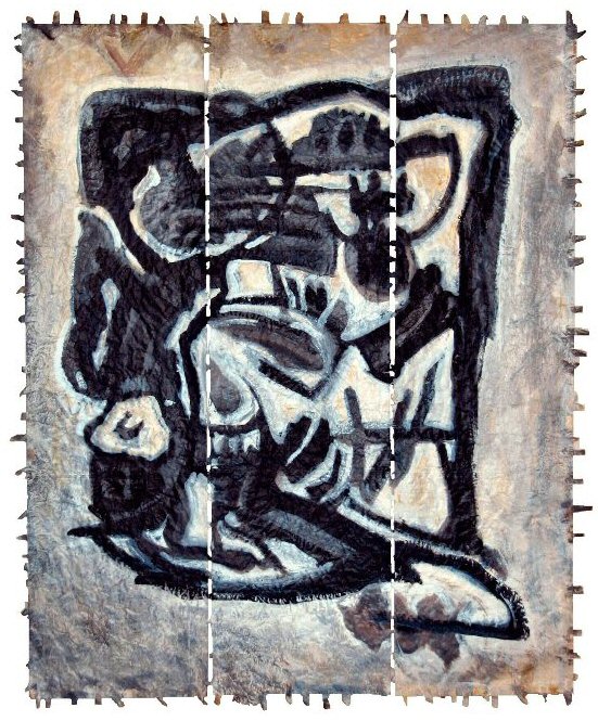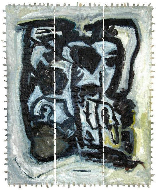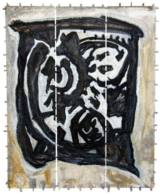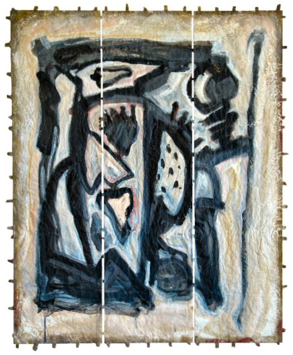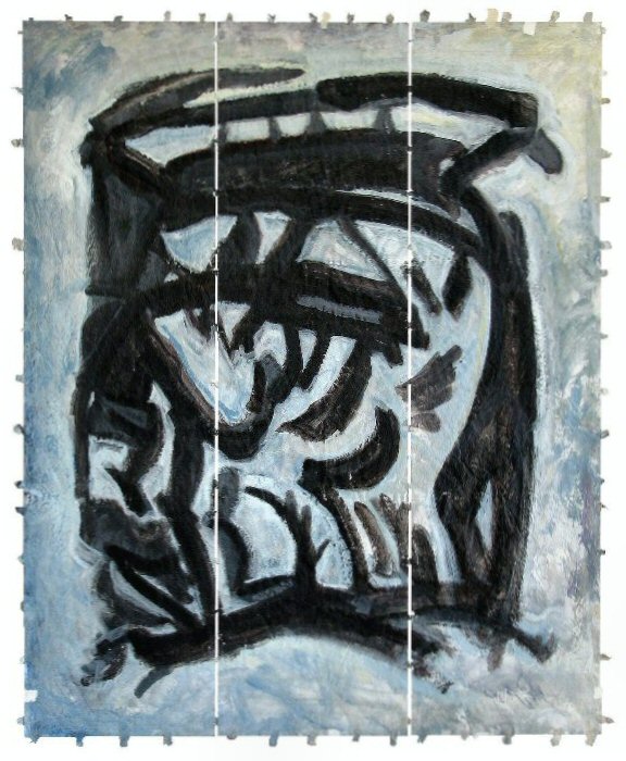 acrylic on stitched paper, (12" x 42" ) x 3 (30cm x 106